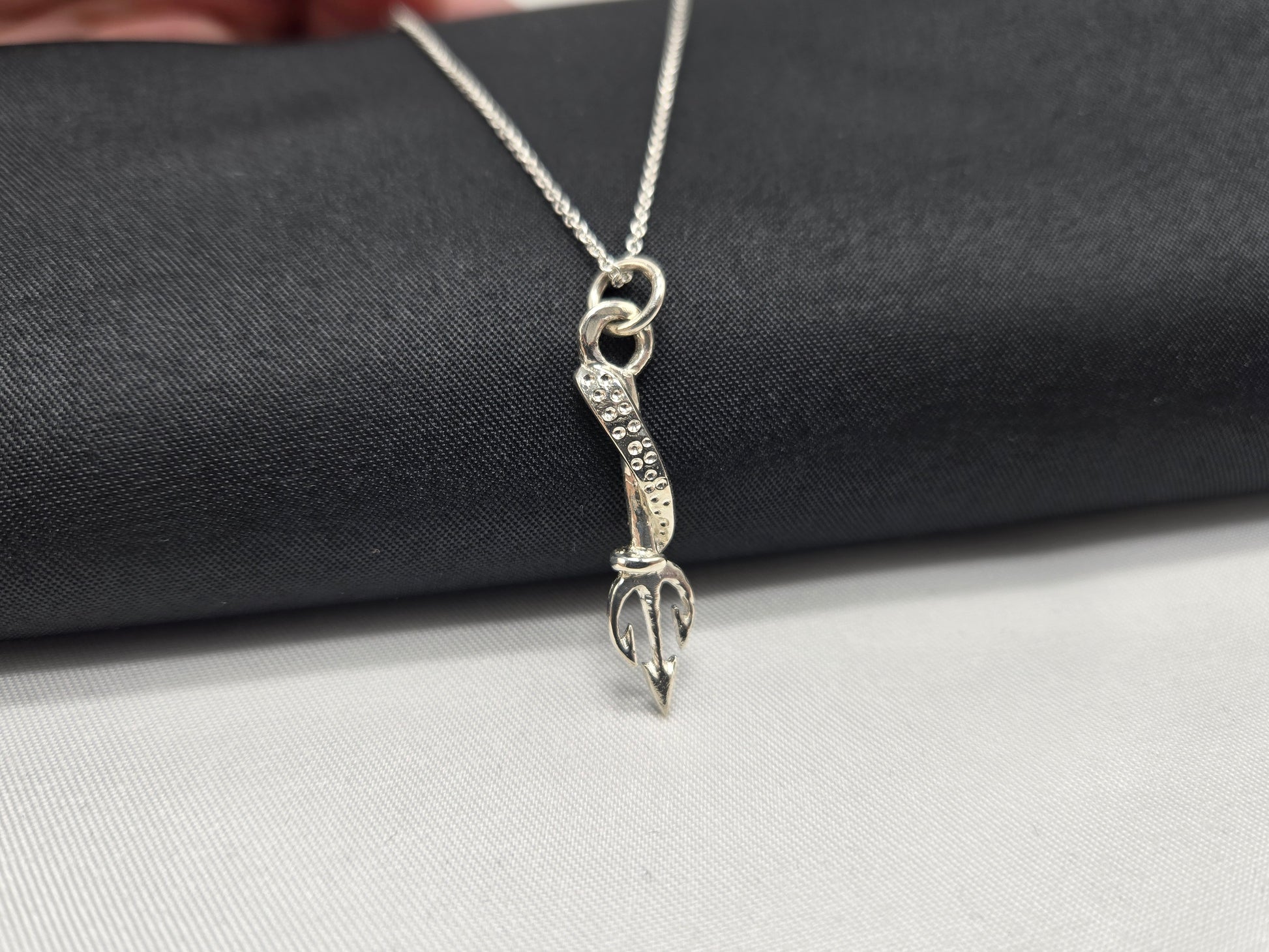 Handmade, solid Sterling silver Trident and Tentacle pendant with Sterling silver cable chain. Trident is about 7mm wide and 30mm tall, not including the bail. Cable chain with lobster clasp is 18" long with jump rings at 16", 17", and 18" so it can be worn at different lengths.
